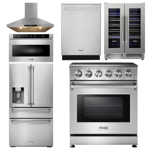 Thor Kitchen Package - 30" Electric Range, Range Hood, Microwave, Refrigerator, Dishwasher, Wine Cooler, AP-HRE3001-14