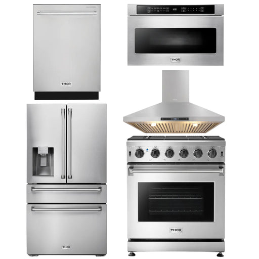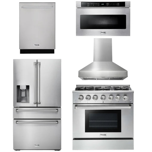 Thor Kitchen Package - 36" Gas Range, Hood, Microwave, Refrigerator with Water and Ice Dispenser, Dishwasher, AP-HRG3618U-W-9
