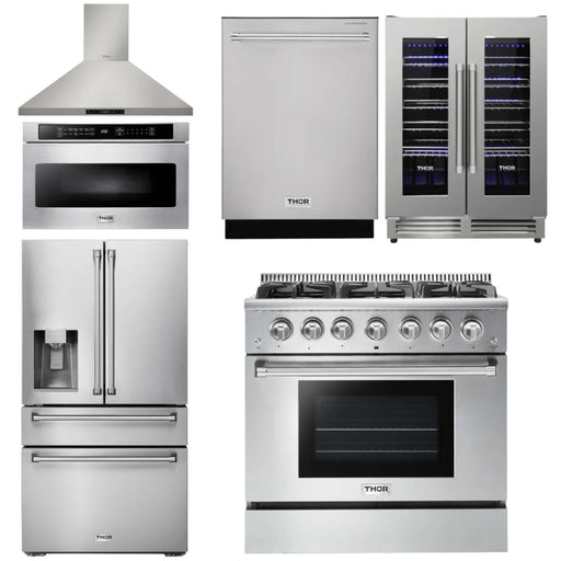 Thor Kitchen Package - 36" Gas Range, Range Hood, Microwave, Refrigerator with Fridge and Ice Maker, Dishwasher, Wine Cooler, AP-LRG3601U-14