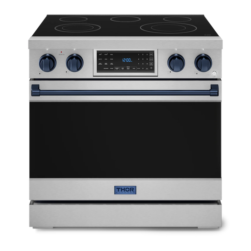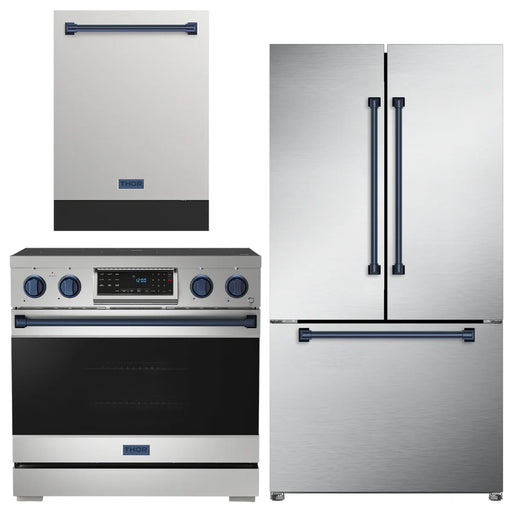 Gordon Ramsay by THOR Kitchen Package - 36" Electric Range, 36" Refrigerator with Ice Maker and Dishwasher in Stainless Steel with Navy Blue Accents, AP-RSE36-BLU-2