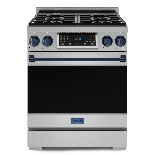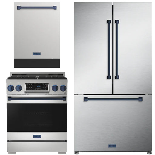 Gordon Ramsay by THOR Kitchen Package - 30" Gas Range, 30" Refrigerator with Ice Maker and Dishwasher in Stainless Steel with Navy Blue Accents, AP-RSG30-BLU-1