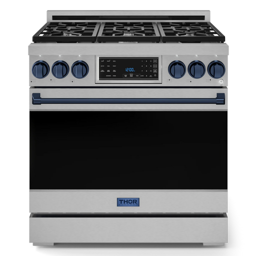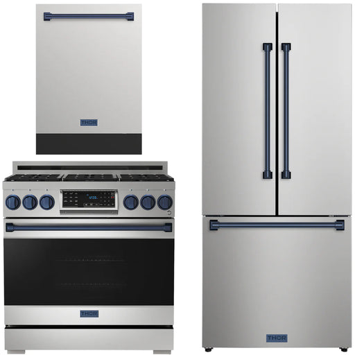 Gordon Ramsay by THOR Kitchen Package - 36" Gas Range, 30" Refrigerator with Ice Maker and Dishwasher in Stainless Steel with Navy Blue Accents, AP-RSG36LP-BLU-1