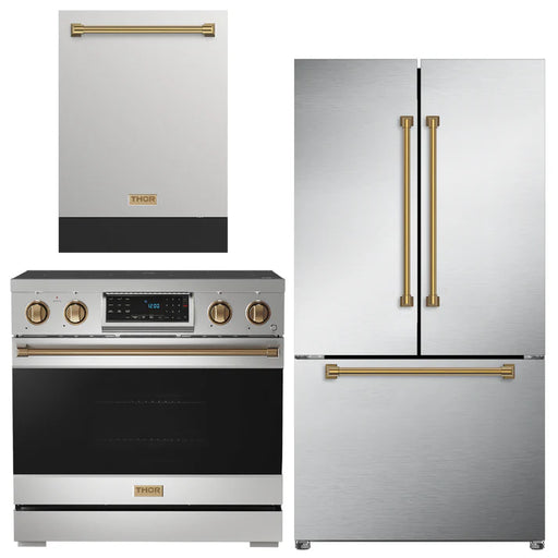 Gordon Ramsay by THOR Kitchen Package - 36" Electric Range, 36" Refrigerator with Ice Maker and Dishwasher in Stainless Steel with Bronze Accents, AP-RSE36-BRZ-2