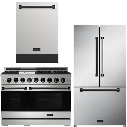 Gordon Ramsay by THOR Kitchen Package - 48" Gas Range, 36" Refrigerator with Ice Maker and Dishwasher in Black Matte with Stainless Steel Accents, AP-RSG48EB-SS-2