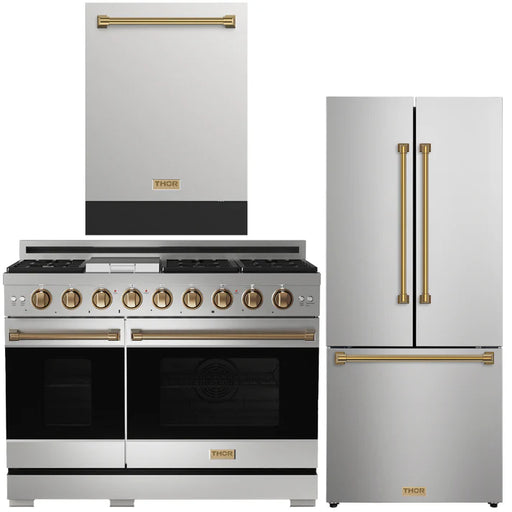 Gordon Ramsay by THOR Kitchen Package - 48" Gas Range, 30" Refrigerator with Ice Maker and Dishwasher in Stainless Steel with Bronze Accents, AP-RSG48ELP-BRZ-1