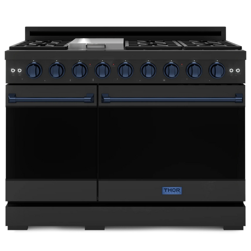 Gordon Ramsay by THOR Kitchen Package - 48" Gas Range, 30" Refrigerator with Ice Maker and Dishwasher in Black Matte with Navy Blue Accents, AP-RSG48EBLP-BLU-1