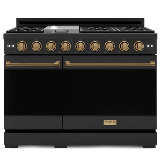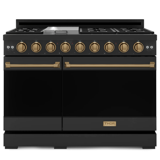 Gordon Ramsay by THOR Kitchen Package - 48" Gas Range, 30" Refrigerator with Ice Maker and Dishwasher in Black Matte with Bronze Accents, AP-RSG48EB-BRZ-1