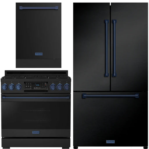 Gordon Ramsay by THOR Kitchen Package - 36" Gas Range, 36" Refrigerator with Ice Maker and Dishwasher in Black Matte with Navy Blue Accents, AP-RSG36B-BLU-2