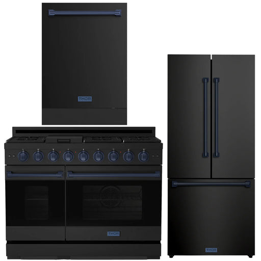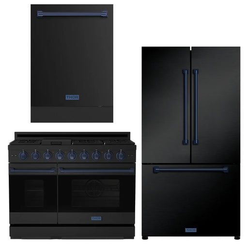 Gordon Ramsay by THOR Kitchen Package - 48" Gas Range, 36" Refrigerator with Ice Maker and Dishwasher in Black Matte with Navy Blue Accents, AP-RSG48EB-BLU-2