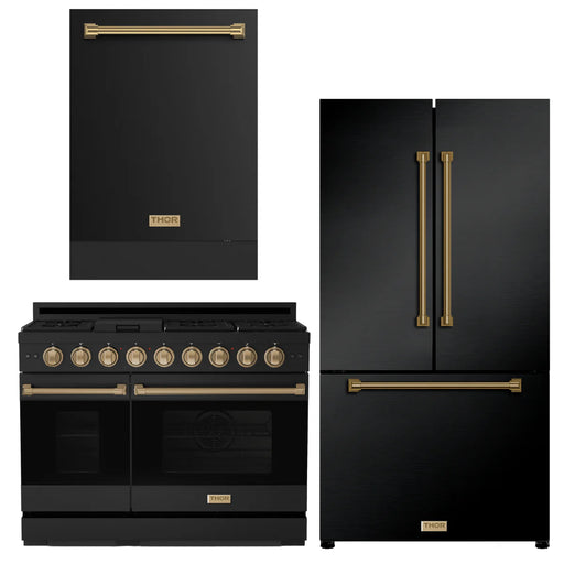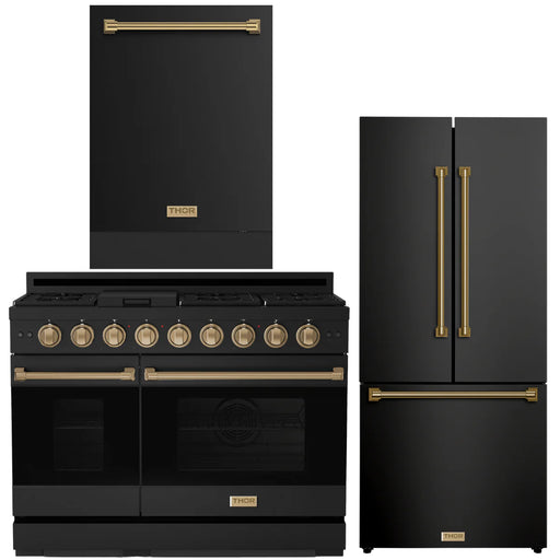 Gordon Ramsay by THOR Kitchen Package - 48" Gas Range, 36" Refrigerator with Ice Maker and Dishwasher in Black Matte with Bronze Accents, AP-RSG48EB-BRZ-2