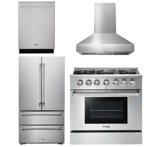 Thor Kitchen Package - 36 In. Natural Gas Burner/Electric Oven Range, Range Hood, Refrigerator, Dishwasher, AP-HRD3606U-W-11