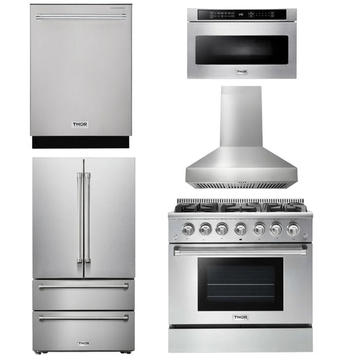 Thor Kitchen Package - 36 In. Natural Gas Burner/Electric Oven Range, Range Hood, Microwave Drawer, Refrigerator, Dishwasher, AP-HRD3606U-W-13