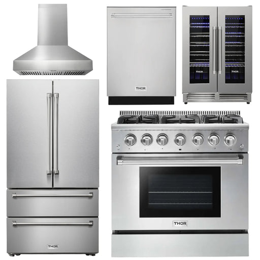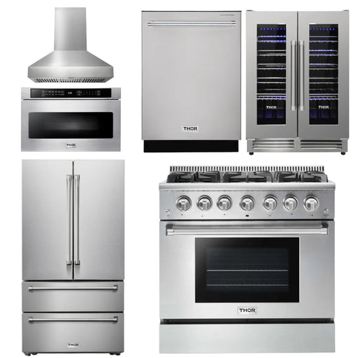 Thor Kitchen Package - 36 In. Natural Gas Burner/Electric Oven Range, Range Hood, Refrigerator, Dishwasher, Wine Cooler, AP-HRD3606U-W-12
