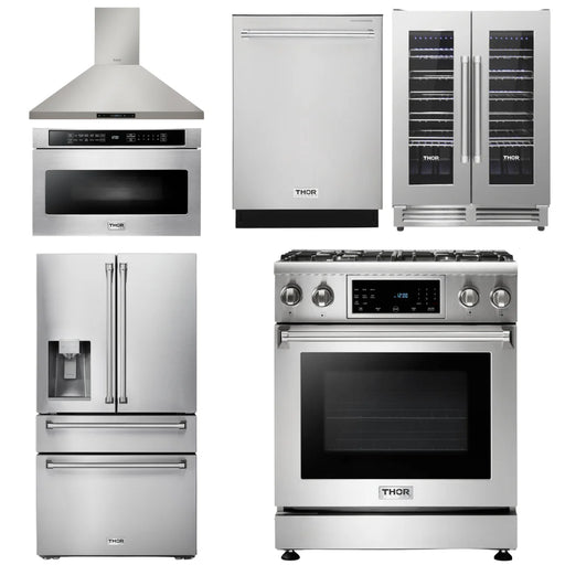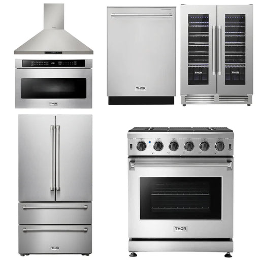Thor Kitchen Package - 30" Propane Gas Range, Range Hood, Microwave, Refrigerator, Dishwasher, Wine Cooler, AP-LRG3001ULP-20