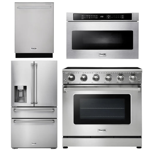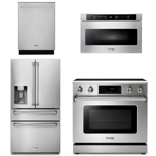 Thor Kitchen Package - 36" Electric Range, Microwave, Refrigerator with Water and Ice Dispenser, Dishwasher, AP-TRE3601-12