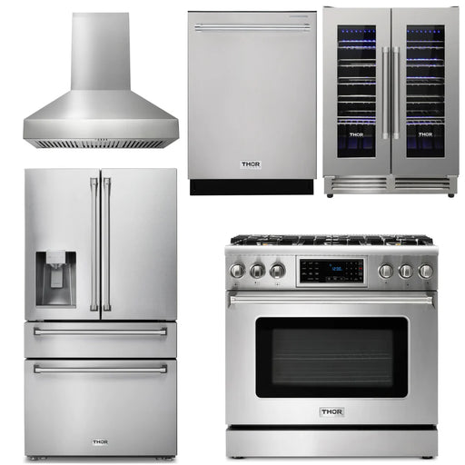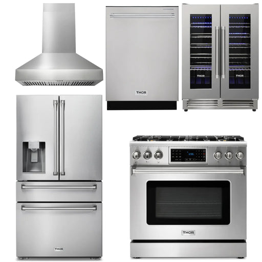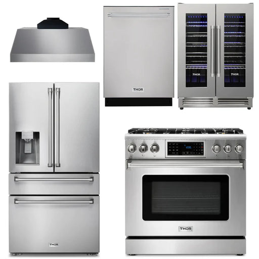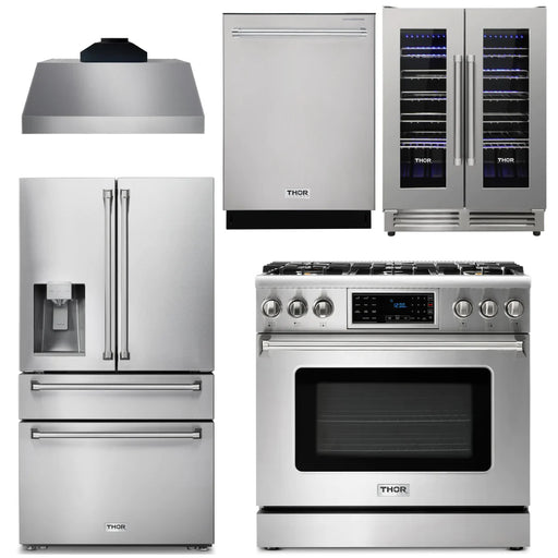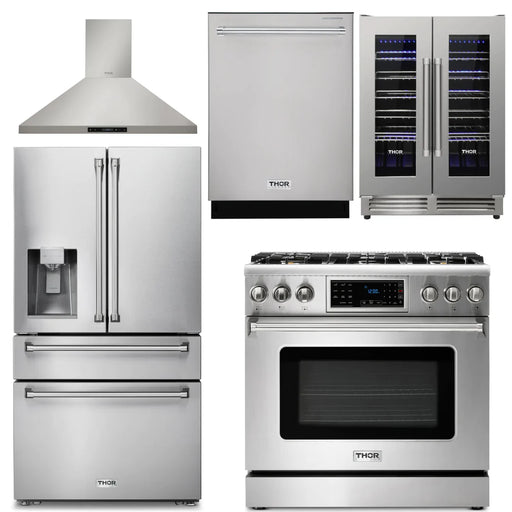 Thor Kitchen Package - 36" Gas Range, Range Hood, Refrigerator with Water and Ice Dispenser, Dishwasher, Wine Cooler, AP-TRG3601-11