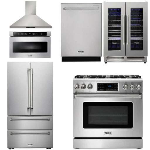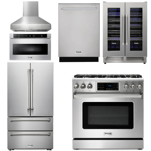 Thor Kitchen Package - 36" Gas Range, Range Hood, Microwave, Refrigerator, Dishwasher, Wine Cooler, AP-TRG3601-C-6