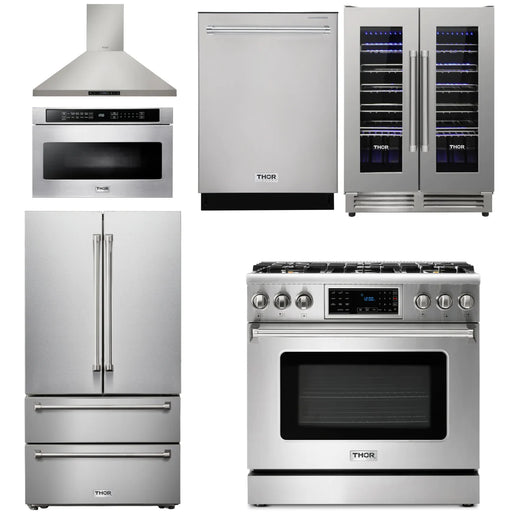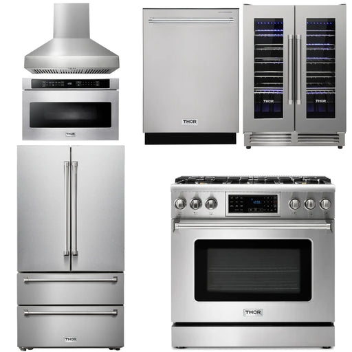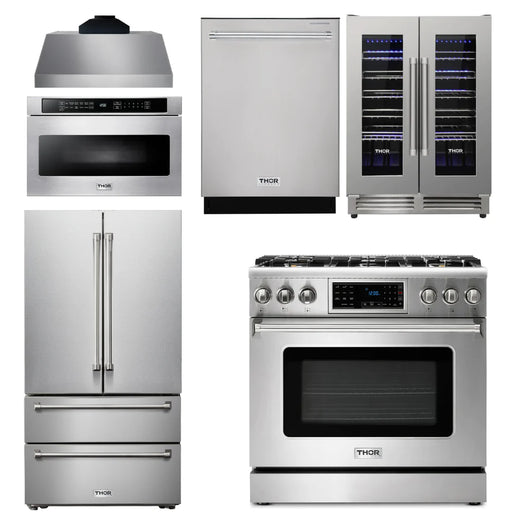 Thor Kitchen Package - 36" Gas Range, Range Hood, Microwave, Refrigerator, Dishwasher, Wine Cooler, AP-TRG3601-W-6