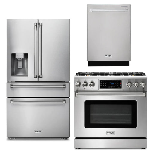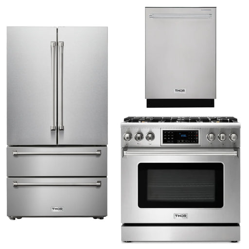 Thor Kitchen Package - 36" Gas Range, Refrigerator with Water and Ice Dispenser, Dishwasher, AP-TRG3601-9