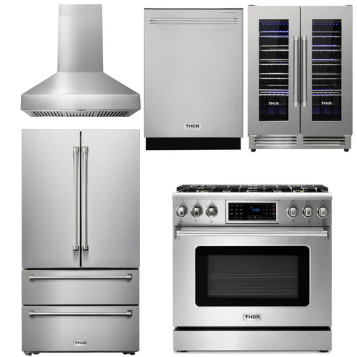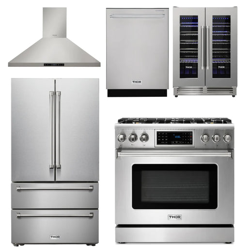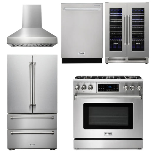 Thor Kitchen Package - 36" Gas Range, Range Hood, Refrigerator, Dishwasher, Wine Cooler, AP-TRG3601-4