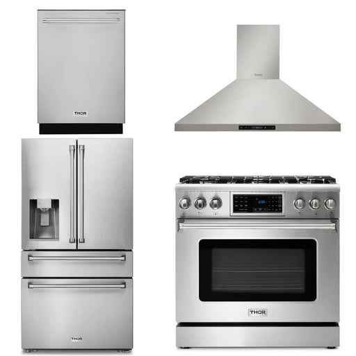 Thor Kitchen Package - 36" Propane Gas Range, Range Hood, Refrigerator with Water and Ice Dispenser, Dishwasher, AP-TRG3601LP-10
