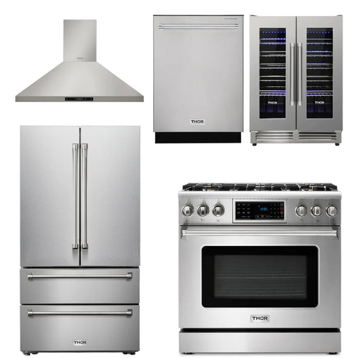 Thor Kitchen Package - 36" Propane Gas Range, Range Hood, Refrigerator with Water and Ice Dispenser, Dishwasher, Wine Cooler, AP-TRG3601LP-11