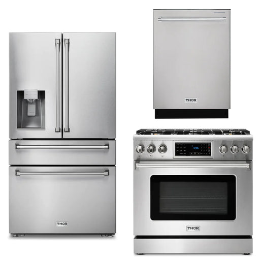 Thor Kitchen Package - 36" Propane Gas Range, Refrigerator with Water and Ice Dispenser, Dishwasher, AP-TRG3601LP-9